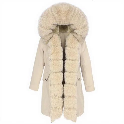 A chic real fox fur longline coat for a sleek and feminine silhouette. Designed for warmth and timeless elegance, perfect for winter days in the city.