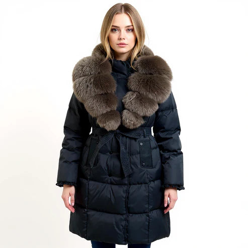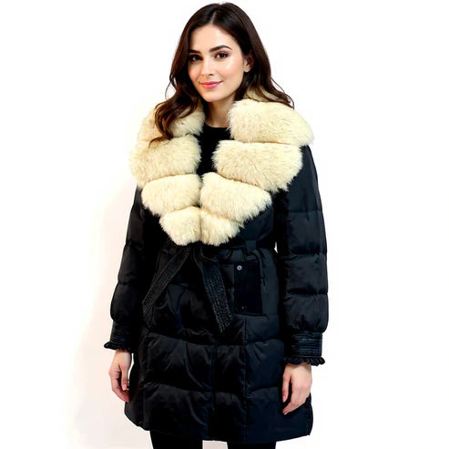 Short black winter jacket with real fur trim on the hood, and a waist belt to define your profile. Compact yet cozy and perfect for those who want warmth without bulk.